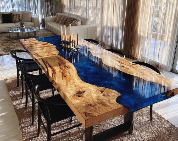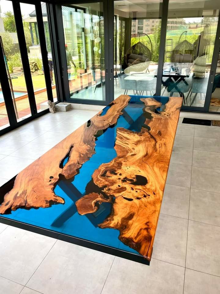 Fabricamos mesas río y piezas únicas combinando madera natural y resina epoxi profesional. Diseño exclusivo y acabado de lujo.